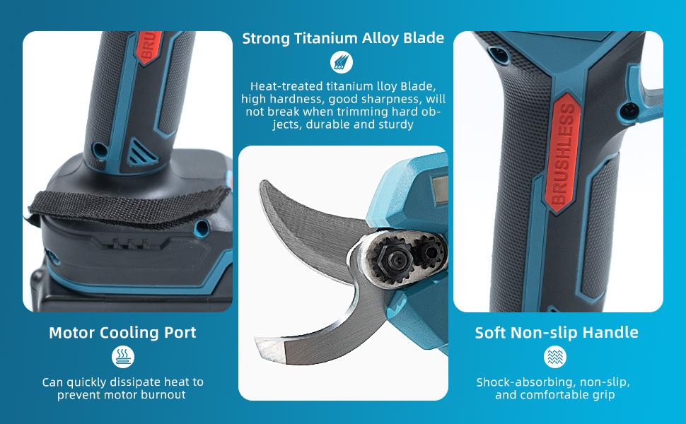 [Sharp and sturdy SK5 blades make pruning easy] This electric pruning shear is equipped with two sturdy SK5 blades for unrivaled cutting power.The SK5 blades are highly resistant to abrasion and corrosion, which ensures that the blades stay sharp for a long time. The combination of a powerful motor and durable SK5 blades makes these cordless pruning shears ideal for professional gardeners and home users alike, providing consistent and reliable performance.